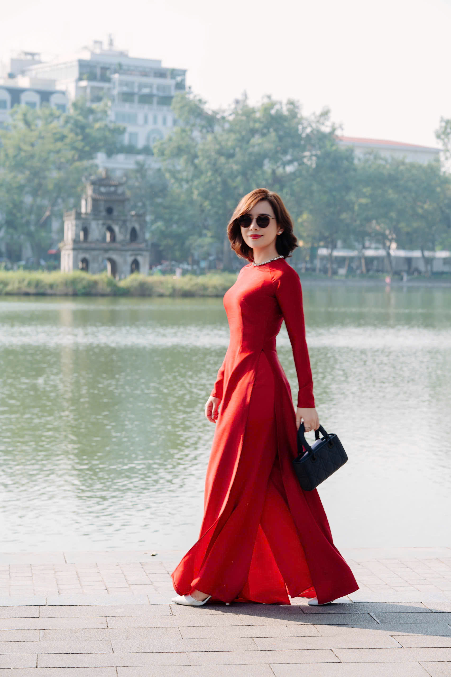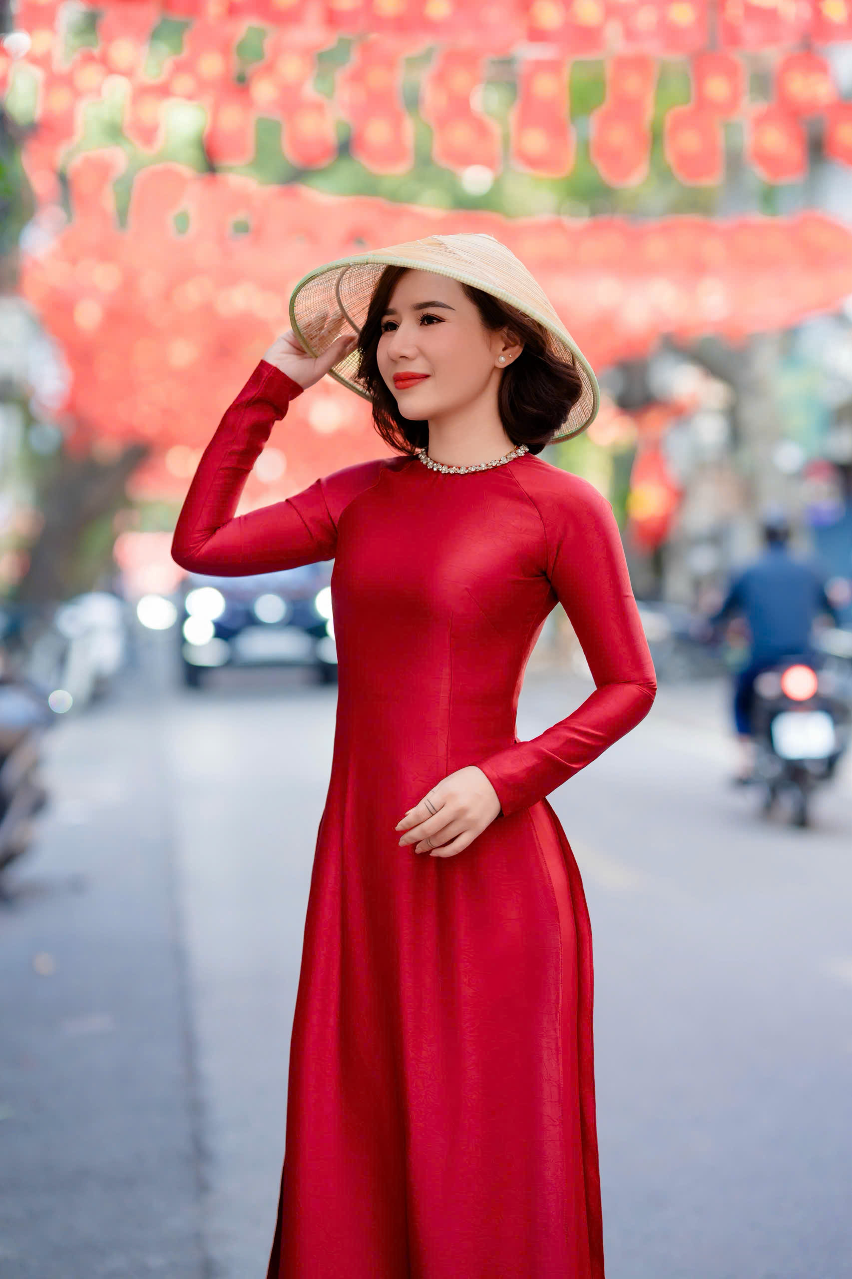Á hậu Đinh Thị Hiệp thướt tha trong tà áo dài đỏ rực rỡ, tựa như một đóa hồng nhan làm giữa không gian rêu phong của Thủ đô những ngày chớm đông.