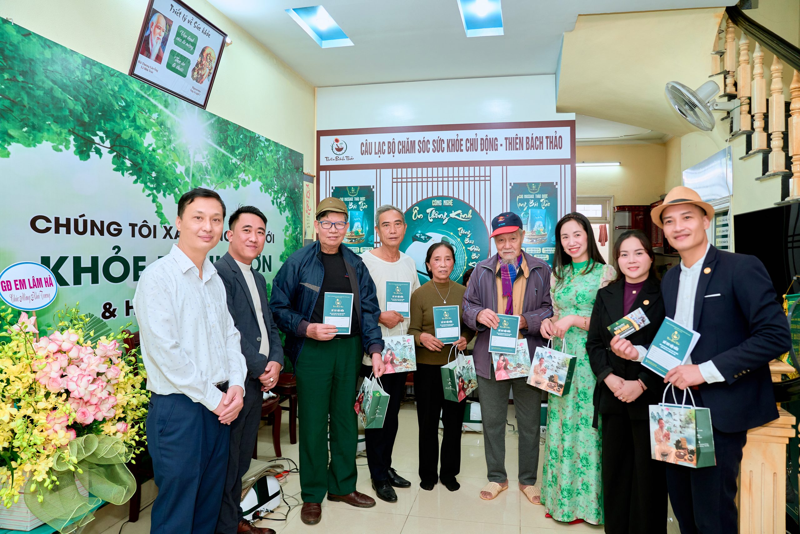 Hoa hậu Thu Thủy trao quà tặng tri ân cho các bác cao tuổi và hội viên câu lạc bộ chăm sóc sức khỏe trong ngày khai trương.